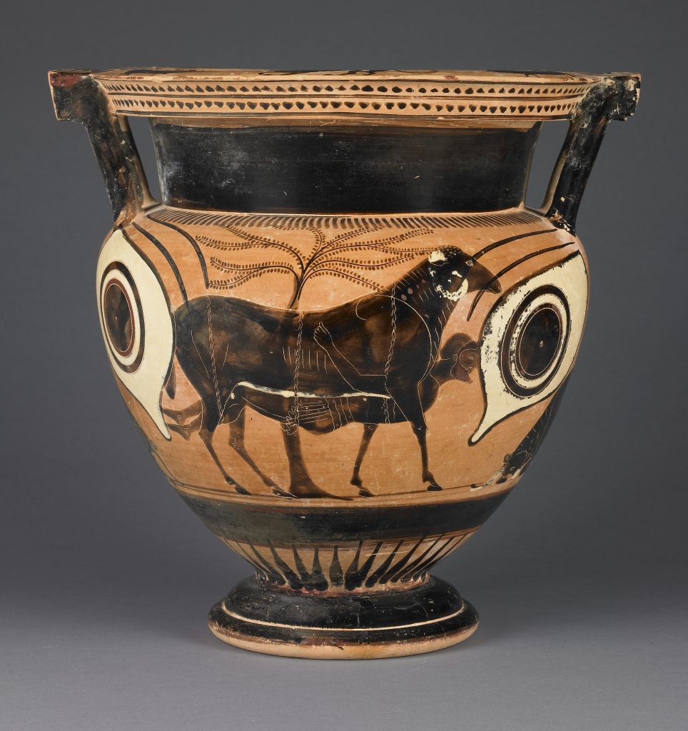 Amongst the many priceless treasures on display at the Archaeological Museum of Eleusis stands a spectacular piece of art: a 7th century BCE funerary amphora depicting the blinding of the cyclops Polyphemus by Odysseus and his companions. In the scene Odysseus is highlighted in chalky white, with one foot off the ground and his arms bent to help guide a stake straight into the eye of the monster in front of him; the viewer is catching Odysseus in action. Meanwhile roughly 7,000 miles away at the Getty Villa in Malibu California, another stunning piece of art recounts the event immediately following the blinding of Polyphemus: Odysseus escaping the cyclops’ cave by clinging to the belly of a ram when the giant sends his flock out to graze.